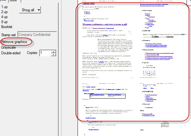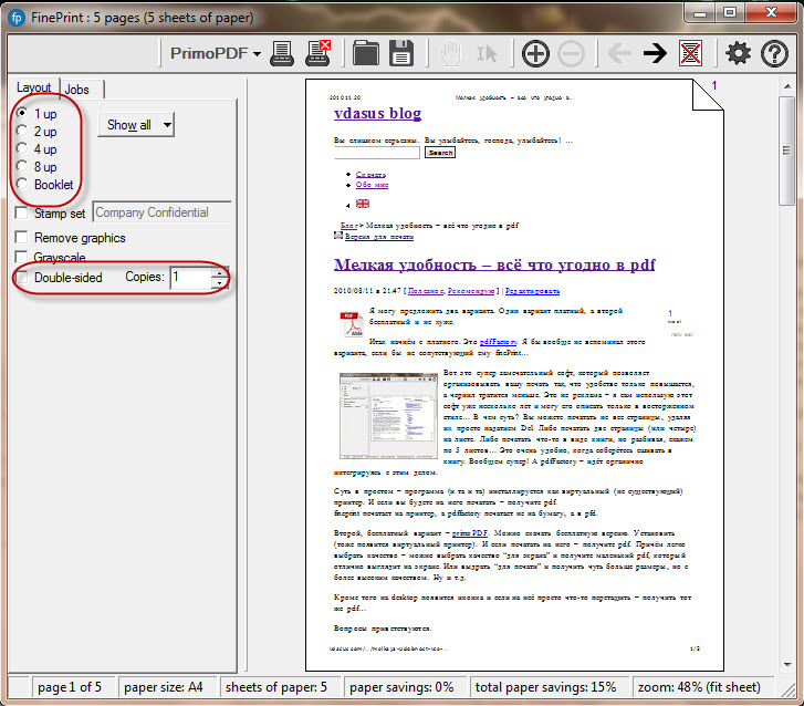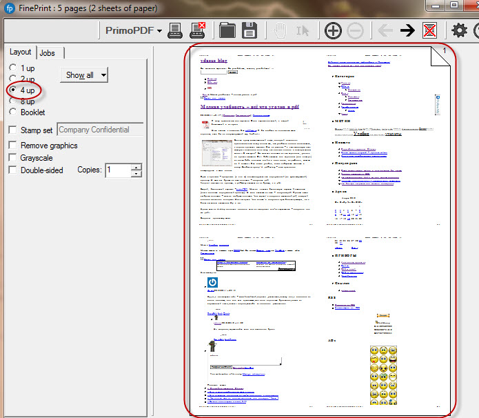 Очень удобная утилита, которая реально экономит чернила \ порошок а на удобстве чтения это не сказывается. Даже наоборот. Многие вещи удобнее читать, если отпечатать их по две страницы на листе. Вы всегда можете выбрать bypass и лист будет отпечатан точно так же, как и без FinePrint…