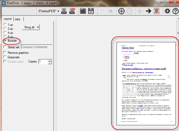 Что это такое? Вот представьте – хотите вы отпечатать книгу. А как потом её склеивать? Сшивать? Неудобно. При большом количестве страниц внутренние будут вылезать вперёд и аккуратно собрать книгу не получится. FinePrint позволяет печатать буклет. Это значит, что книга печатается так, что вы можете согнуть пополам 5 листов и они будут как в обычной книге на первой странице слева – первая страница, справа вторая, и так далее до пятого листа. Потом нумерация начинается так, что опять же согнув пять листов и подложив их к уже согнутым вы получите продолжение.