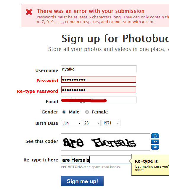 Далее вводим некоторые данные. Обратите внимание, что пароль должен быть не менее 6 символов